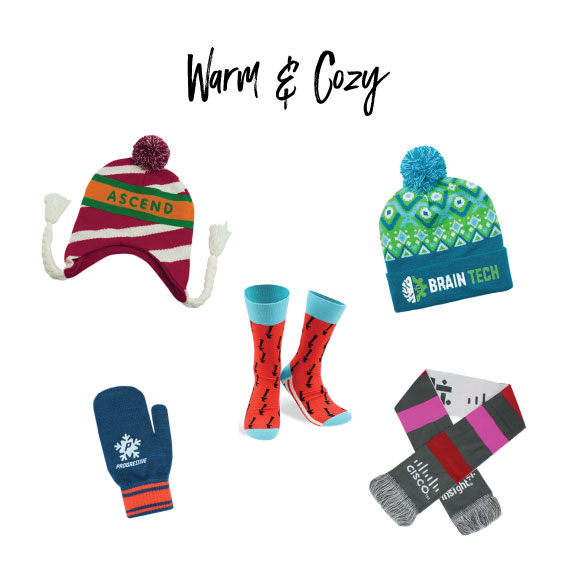 Bundle up! It’s getting cold outside, so we love the idea of sending something warm and cozy to keep your recipients toasty and comfy during the next few months. Socks, hats, mittens, scarves, or even jackets and coats. There are SO many cool options for customization for a lot of these items, too.